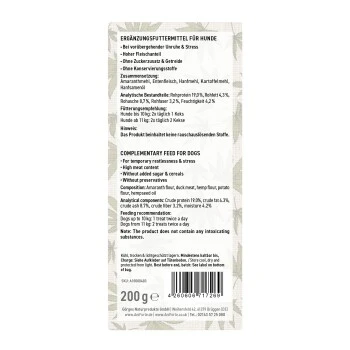 Zudem bieten sie Deinem Hund das Beste aus der Natur: Eine Kombination aus Entenfleisch, qualitativ hochwertigen Rohstoffen sowie Hanfmehl aus EU-zertifizierten Nutzhanfsorten. Durch den hohen Fleischanteil heben die Hundekekse sich gezielt von durchschnittlichen Hanf für Hunde Snacks ab. Die artgerechten Funktionssnacks eignen sich ideal zur Gabe bei vorübergehender Unruhe oder in bestimmten Stress- und Angstsituationen, um Deinen Vierbeiner zu beruhigen und entspannen.
