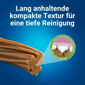 Die Experten von PURINA haben mit DENTALIFE einen innovativen Zahnpflege-Snack entwickelt, bei dem wissenschaftlich erwiesen ist, dass er selbst die schwer erreichbaren hinteren Zähne reinigt, die am anfälligsten für die Bildung von Plaque und Zahnstein sind. Die kompakte Textur der Zahnpflege-Sticks sorgt für eine Tiefenreinigung der Zähne und kämpft gegen schlechten Atem und Mundgeruch bei Hunden an. Dank der besonders effektiven Zahnreinigung des DuraPlus reicht es aus, wenn Sie Ihren treuen Begleiter jeden zweiten Tag ein Zahnpflege-Leckerli geben.