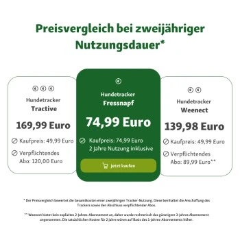 Der Fressnapf GPS-Tracker für Hunde ist der einzige seiner Art, der kein Abomodell nutzt. Das heißt, für einmalig 74,99 Euro haben Sie garantiert 2 Jahre lang keine monatlichen Kosten.