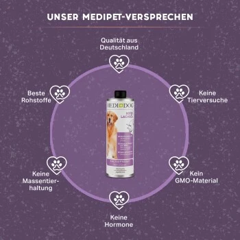 Das Medidog Lachsöl ist für alle Hunde geeignet. Es fördert ein samtig strahlendes Fell, eine vitale Haut und unterstützt bei der Abdeckung des Omega-3-Fettsäurenhaushaltes. Da der Organismus der Tiere selbst nicht die hochwertigen Fettsäuren bilden kann, müssen sie über die Nahrung aufgenommen werden.